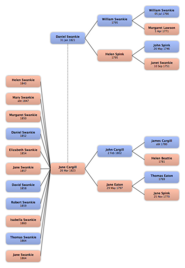 Jane Cargill | 26 Mar 1823 | Helen Swankie Mary Swankie Margaret Swankie Daniel Swankie Elizabeth Swankie Jane Swankie David Swankie Robert Swankie Isabella Swankie Thomas Swankie Jane Swankie |