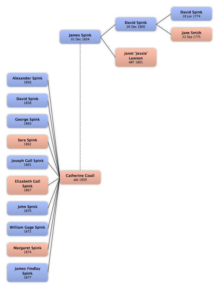 Catherine Coull | abt 1830 | Alexander Spink David Spink George Spink Sara Spink Joseph Gall Spink Elizabeth Gall Spink John Spink William Gage Spink Margaret Spink James Findlay Spink |